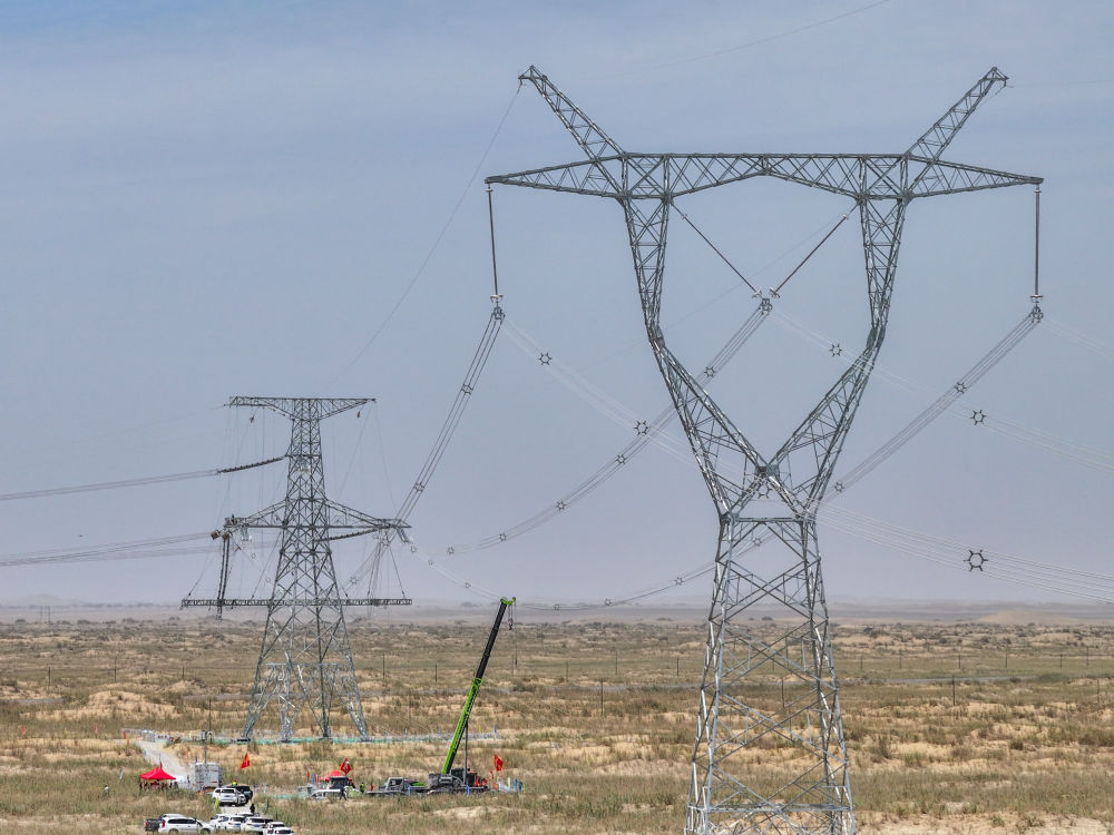 2025年7月13日,在塔里木盆地南緣的新疆和田地區(qū)民豐縣,隨著牽引機將最后一段電線成功從183號鐵塔拽至188號鐵塔,歷時15年建設(shè)的環(huán)塔里木盆地750千伏輸變電工程全線貫通(無人機照片)。新華社記者 丁磊 攝