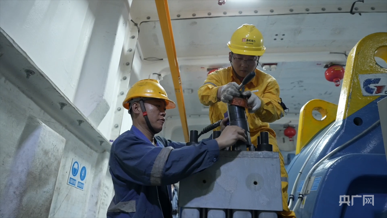李亞雄與同伴對風(fēng)機內(nèi)部部件進(jìn)行巡檢維護(hù)(央廣網(wǎng)發(fā) 受訪者供圖)