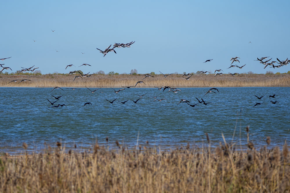 2025年11月13日,越冬候鳥在山東黃河三角洲國家級(jí)自然保護(hù)區(qū)飛翔。新華社記者 朱崢 攝