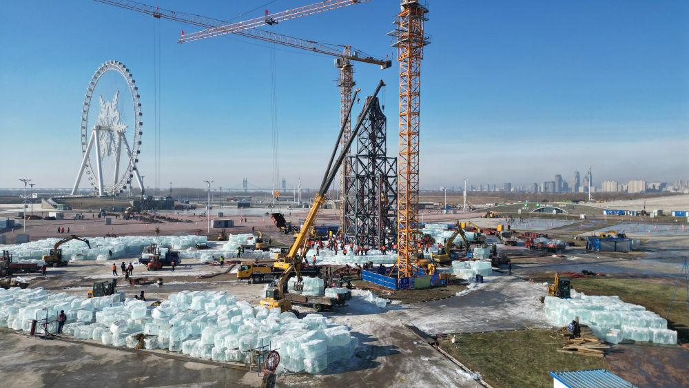 2025年11月25日,隨著20萬立方米存冰陸續(xù)運(yùn)抵園區(qū),第二十七屆哈爾濱冰雪大世界冰建工程正式啟動(dòng)(無人機(jī)照片)。新華社發(fā)(劉洋 攝)