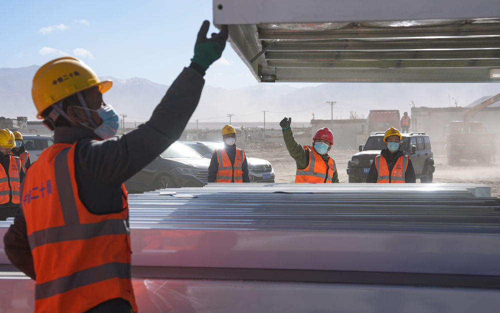 2025年1月9日,工作人員在定日縣長(zhǎng)所鄉(xiāng)森嘎村搭建板房。