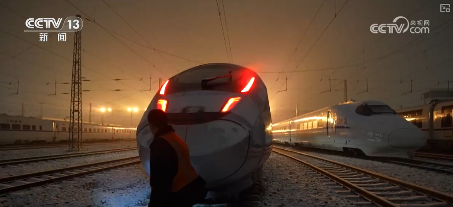央視網(wǎng)消息:12月12日,京津冀地區(qū)迎來今冬首場大范圍降雪。為確保動車組列車在低溫環(huán)境下運行狀態(tài)良好,國鐵北京局連夜開展防寒加溫作業(yè)。工作人員在零下5℃的環(huán)境中,為動車組啟動空調(diào)系統(tǒng),提升車廂溫度,防止車內(nèi)設(shè)備、水管等因低溫凍結(jié),保障動車組列車第二天安全正點出發(fā)。