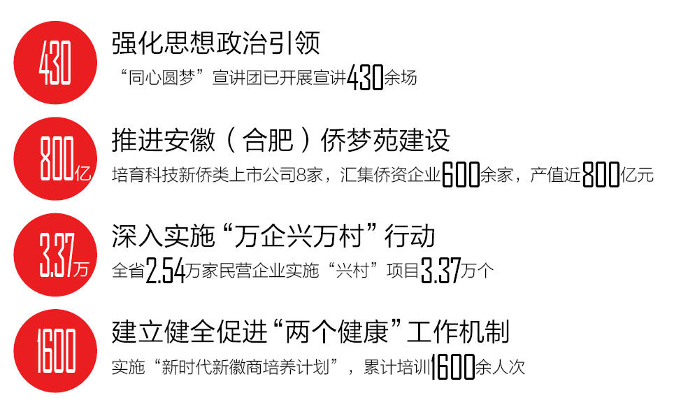 堅(jiān)持和落實(shí)“兩個(gè)毫不動(dòng)搖”,建立健全促進(jìn)“兩個(gè)健康”工作機(jī)制。持續(xù)優(yōu)化民營(yíng)經(jīng)濟(jì)發(fā)展環(huán)境,促進(jìn)經(jīng)濟(jì)社會(huì)高質(zhì)量發(fā)展。召開(kāi)全省民營(yíng)經(jīng)濟(jì)統(tǒng)戰(zhàn)工作會(huì)議,明確36項(xiàng)重點(diǎn)任務(wù)和55家責(zé)任單位,建立13家省直單位組成的聯(lián)席會(huì)議制度。聚焦凝心鑄魂,全省統(tǒng)戰(zhàn)系統(tǒng)累計(jì)開(kāi)展理想信念教育和經(jīng)濟(jì)形勢(shì)政策教育808場(chǎng)次,覆蓋3.82萬(wàn)人次民營(yíng)經(jīng)濟(jì)人士。突出年輕一代培育,實(shí)施“新時(shí)代新徽商培養(yǎng)計(jì)劃”,累計(jì)培訓(xùn)1600余人次,建立約2500人的代表人士數(shù)據(jù)庫(kù),推動(dòng)青年商會(huì)組織省市全覆蓋,推薦4300余名優(yōu)秀青年企業(yè)家進(jìn)入各級(jí)人大、政協(xié)。引導(dǎo)企業(yè)履行社會(huì)責(zé)任,完成光彩事業(yè)發(fā)起實(shí)施30周年相關(guān)調(diào)研及先進(jìn)典型推薦宣傳工作。