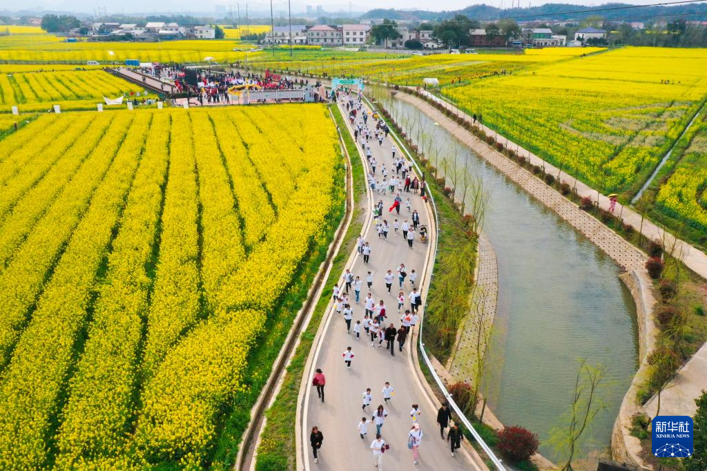 2024年3月22日,瀏陽市永安鎮(zhèn)豐裕村舉辦的油菜花節(jié),村民和游客參加花田鄉(xiāng)野跑活動(無人機(jī)照片)。新華社發(fā)