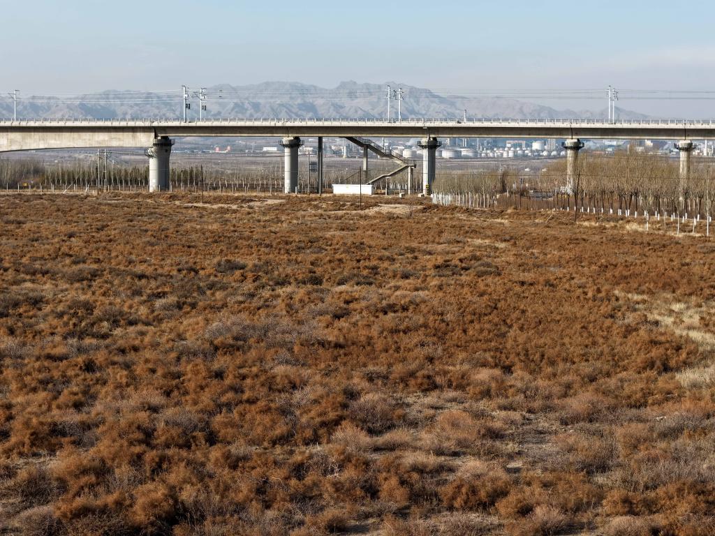 這是12月11日拍攝的包銀高鐵二道坎跨京藏高速特大橋,橋下是內(nèi)蒙古西鄂爾多斯國家級(jí)自然保護(hù)區(qū)烏海片區(qū)(無人機(jī)照片)。新華社記者 李志鵬 攝