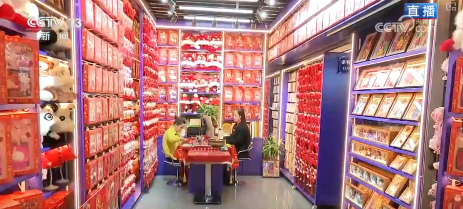這里是商貿(mào)城的一區(qū),這家店鋪?zhàn)兓貏e明顯,半年前記者來的時(shí)候,這里還擺滿了出口國外的節(jié)日用品。而現(xiàn)在,店里完全是另一番景象,放眼望去,滿滿的都是中國人自己過春節(jié)會(huì)用到的各種精美禮品和裝飾。