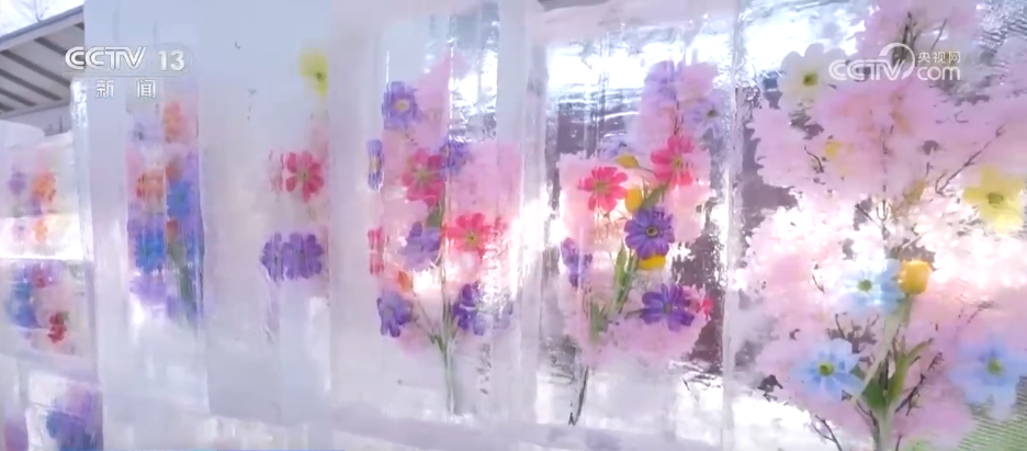 看完了霧凇,剛才說到的冰雕在哪里呢?大家看這面鮮花冰墻就是進(jìn)入冰雕觀賞區(qū)的標(biāo)志:它以冰塊為載體,嵌入了青海本土的郁金香、格?;ǎ€有西寧市花丁香花,嬌艷色彩與冰晶的純凈相互映襯。