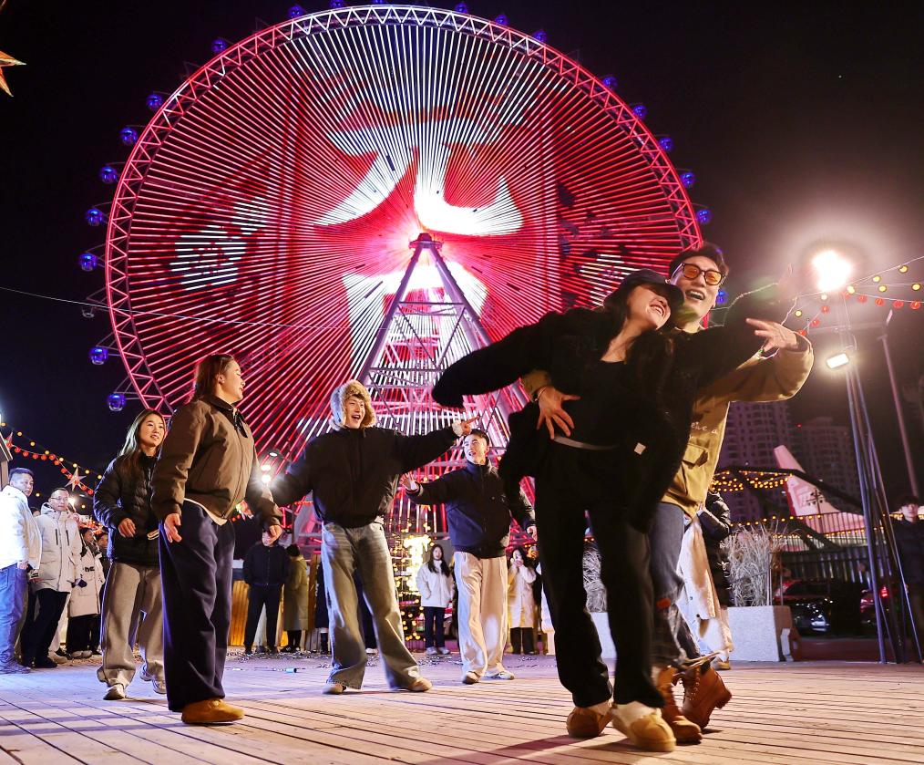 1月1日凌晨,游客在河北省秦皇島市海港區(qū)的摩天輪前跳舞,迎接新年的到來(lái)。新華社發(fā)(曹建雄攝)