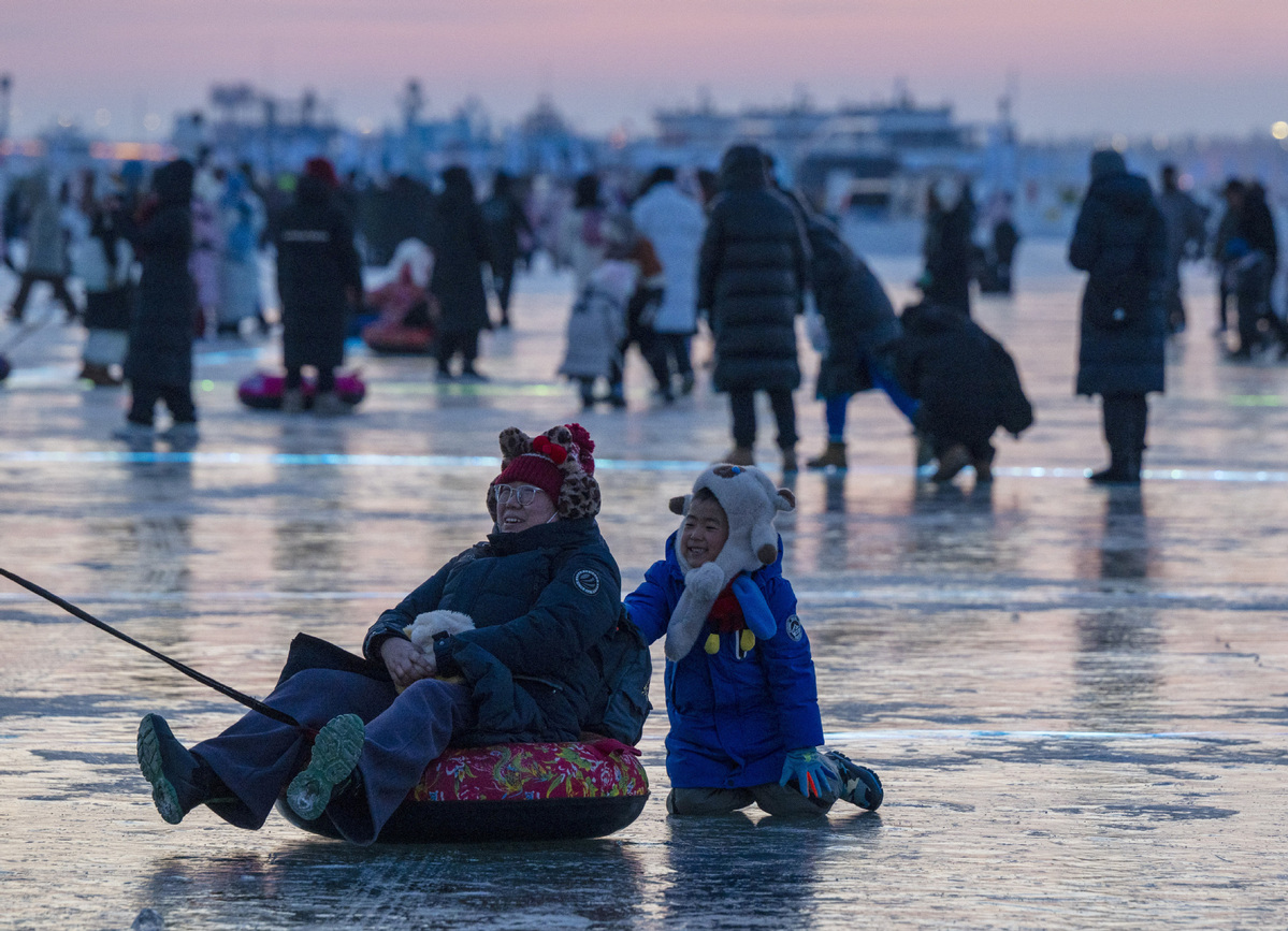 1月2日,人們在第八屆哈爾濱松花江冰雪嘉年華園區(qū)內(nèi)體驗(yàn)冰上娛樂項(xiàng)目。(圖片來源:新華社)