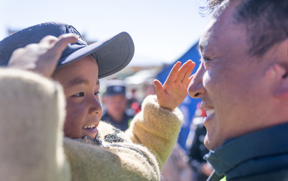 2025年1月14日,在受到地震波及的西藏定日縣長所鄉(xiāng)嘎布村,一名小朋友戴上了參加抗震救災(zāi)工作的移民警察米瑪次仁的帽子,向他敬禮。新華社記者 丁增尼達 攝