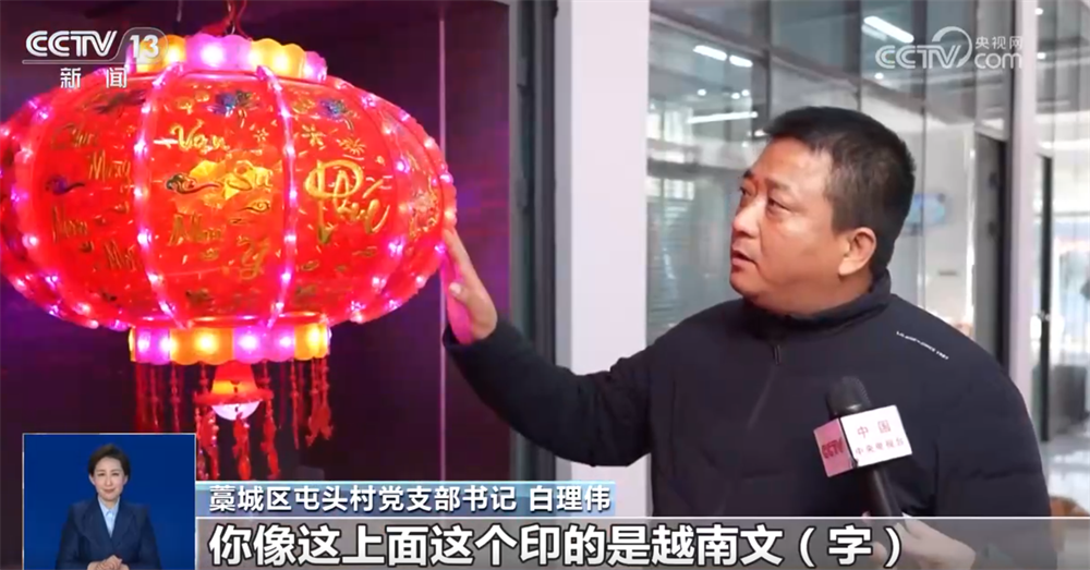 藁城區(qū)屯頭村黨支部書記 白理偉:通過宮燈博覽會,對接了市場、增加了客戶,你像這個上面印的是越南文字,一些吉祥話,這是近兩年新開發(fā)的產品。