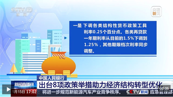 一是下調(diào)各類結(jié)構(gòu)性貨幣政策工具利率0.25個百分點(diǎn)。各類再貸款一年期利率從目前的1.5%下調(diào)到1.25%,其他期限檔次利率同步調(diào)整。