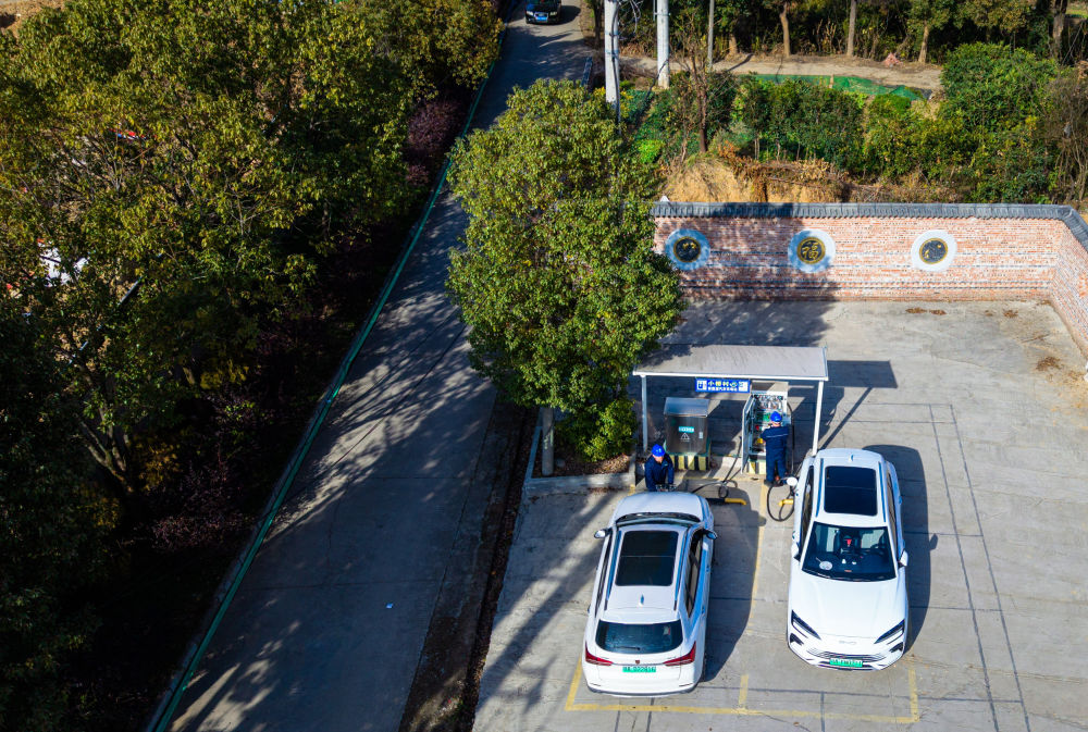 2026年1月11日,國網(wǎng)鄂州供電公司工作人員對鄂州市鄂城區(qū)西山街道小橋村充電站的充電設(shè)備進行巡檢(無人機照片)。新華社記者 肖藝九 攝