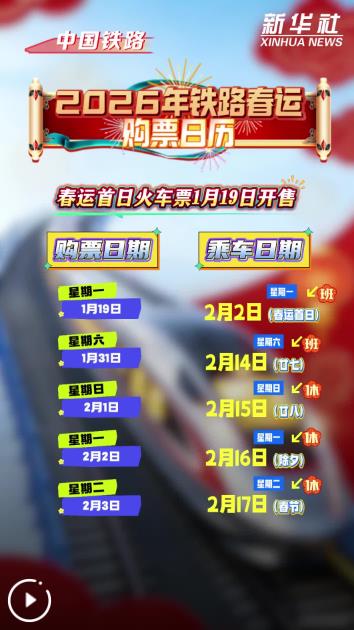 記者1月18日從中國國家鐵路集團有限公司獲悉,2026年鐵路春運自2月2日開始,至3月13日結(jié)束,為期40天,全國鐵路預(yù)計發(fā)送旅客5.39億人次,節(jié)前客流高峰日預(yù)計為2月13日(臘月廿六),節(jié)后客流高峰日預(yù)計為2月23日(正月初七),春運首日火車票將于1月19日開始發(fā)售。