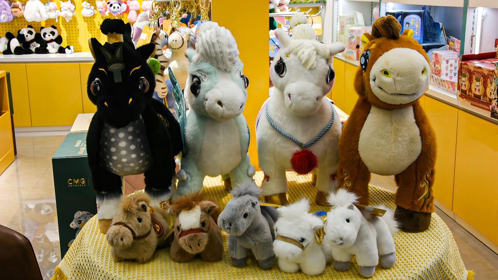 義烏國際商貿(mào)城“萌玩匯”店鋪內(nèi)陳列的部分“馬”公仔。新華社記者劉澈 攝