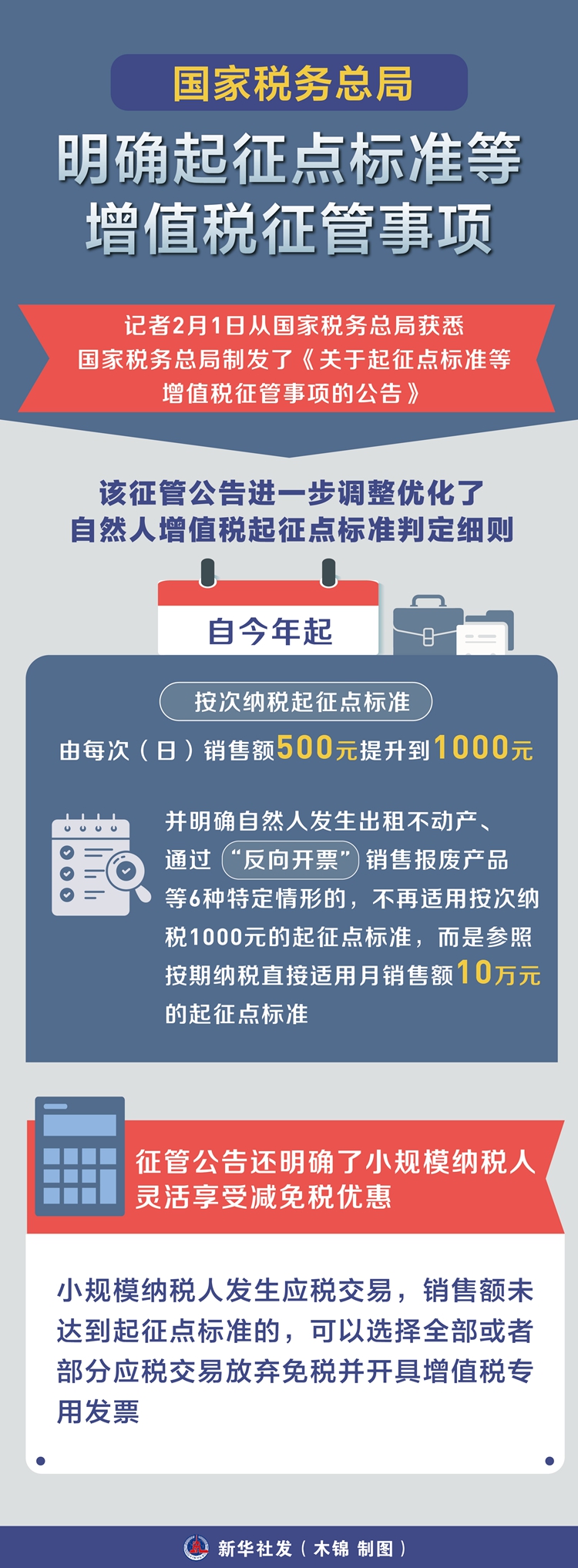 記者2月1日從國家稅務(wù)總局獲悉,國家稅務(wù)總局制發(fā)了《關(guān)于起征點(diǎn)標(biāo)準(zhǔn)等增值稅征管事項(xiàng)的公告》,就起征點(diǎn)標(biāo)準(zhǔn)判定、稅收優(yōu)惠政策適用等增值稅征管事項(xiàng)作了進(jìn)一步明確,細(xì)化操作要求,推動(dòng)增值稅法及其實(shí)施條例落實(shí)落地。