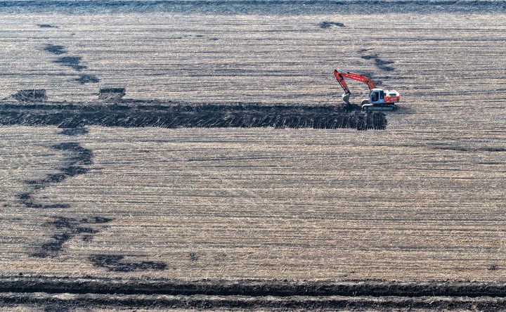 2025年3月11日,在天津市津南區(qū)八里臺(tái)鎮(zhèn)大韓莊村,工人駕駛挖掘機(jī)進(jìn)行高標(biāo)準(zhǔn)農(nóng)田施工作業(yè)(無人機(jī)照片)。
