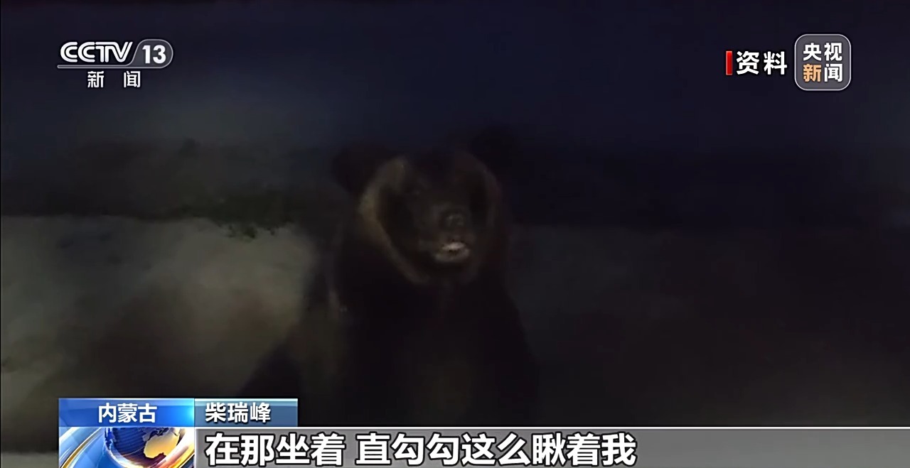 柴瑞峰:我就拿手機(jī)往后面一照,突然看見一只黑熊,它離我就四五米遠(yuǎn)的距離上,在那坐著,直勾勾這么瞅著我,這個(gè)手機(jī)的亮光,照在這個(gè)熊的眼睛上,它冒那個(gè)光。當(dāng)時(shí)心里就特別特別害怕,跟前有一棵樹,我順著那棵樹爬上去了。