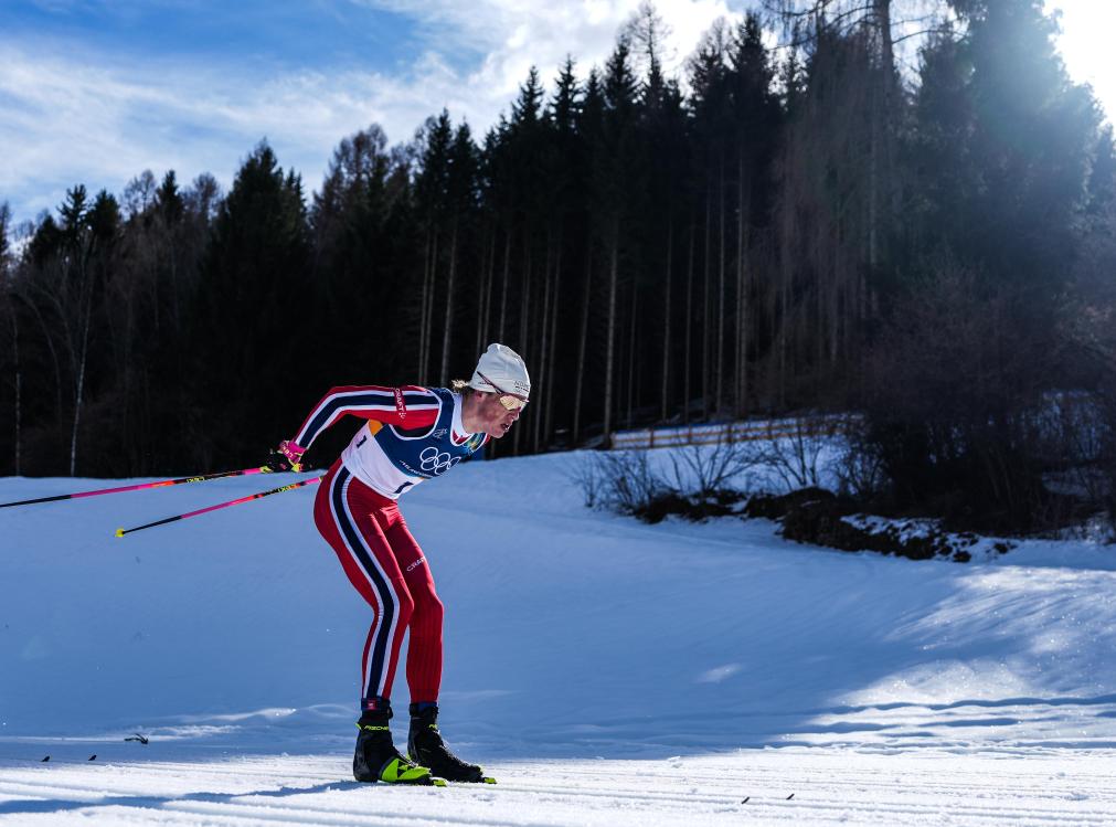 2月8日,冠軍挪威選手克萊博在比賽中。當地時間2月8日,米蘭-科爾蒂納冬奧會越野滑雪男子雙追逐比賽在意大利泰塞羅舉行。新華社記者 彭子洋 攝