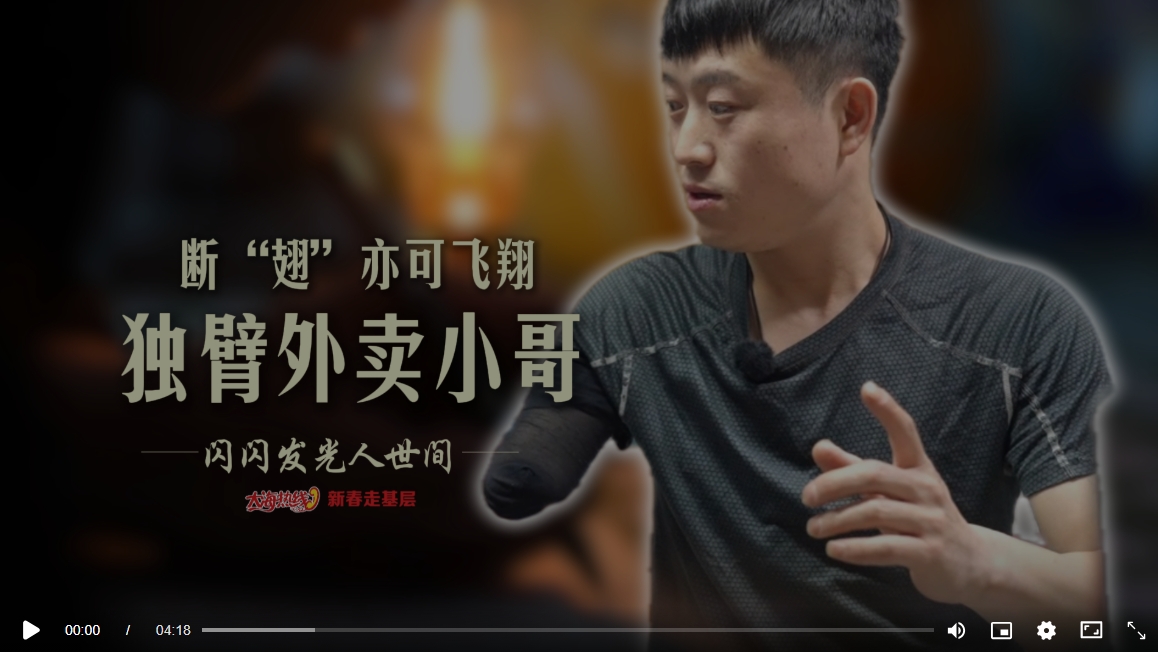 18歲意外失去右臂,不向命運低頭,單手騎車、送餐、爬樓,憑著樂觀和韌勁,風(fēng)雨無阻跑遍阜新街巷。每天工作12小時、日均配送60單、爬樓100多層、騎行100多公里……