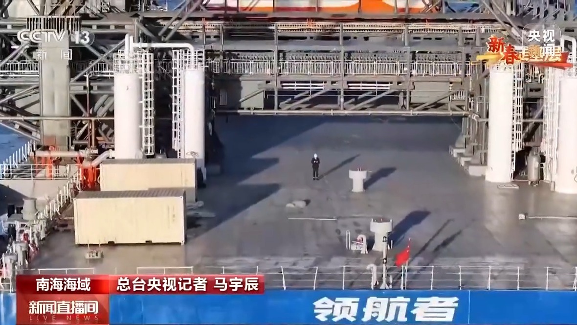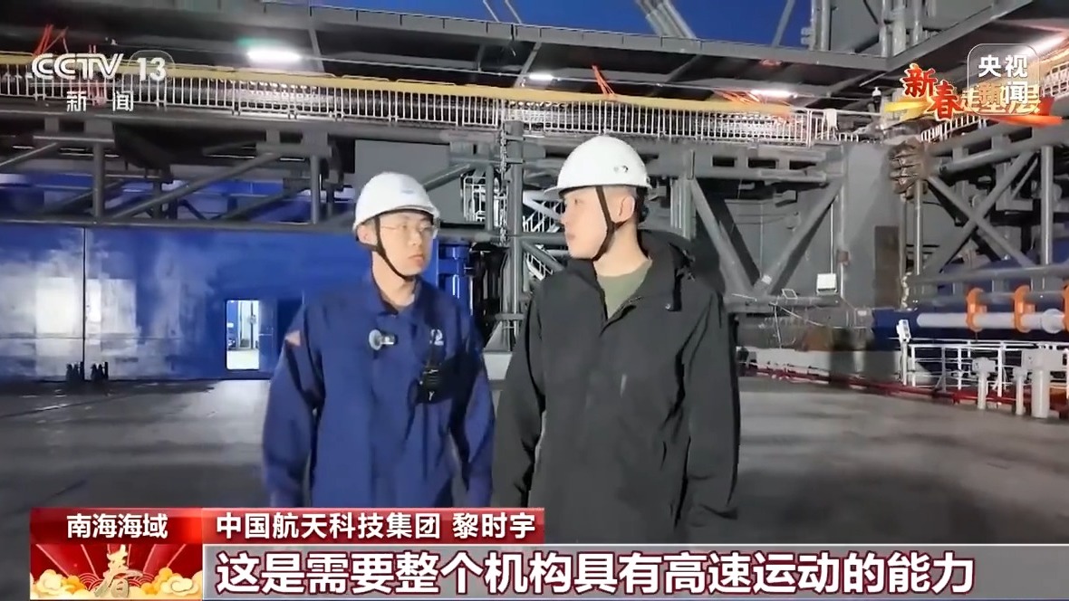 總臺記者 馬宇辰:“領航者”號海上回收平臺長144米,寬50米,滿載排水量超過2.5萬噸,是個名副其實的大家伙。但是發(fā)射塔架的高度接近70米,加上船體和天線,整體的高度接近30層樓高,所以它的重心是非常高的,再加上冬天的海況比較惡劣,我的感覺就是整個船體都在不規(guī)律地搖晃著。