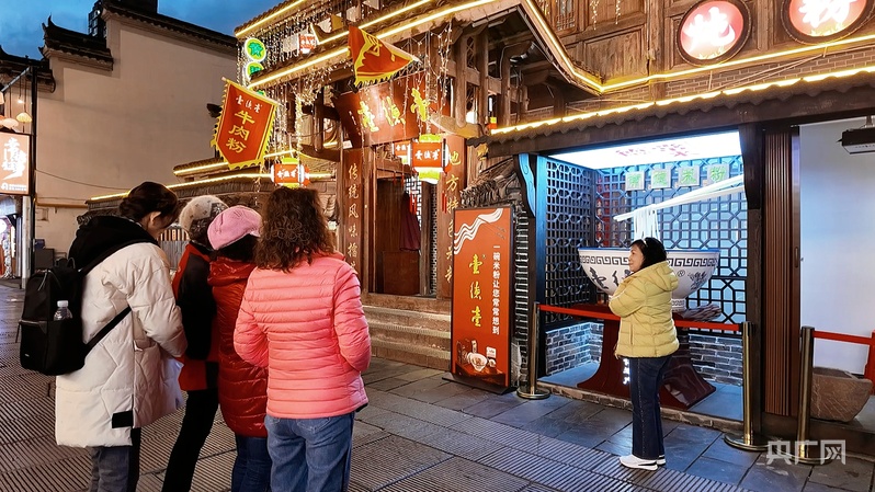 游客在常德米粉店前打卡(央廣網(wǎng)記者黃珂嵐 攝)