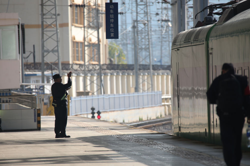 ↑ 2月16日,在南京火車站,乘務(wù)人員在站臺上解答旅客問詢。新華社發(fā)(蘇陽攝)