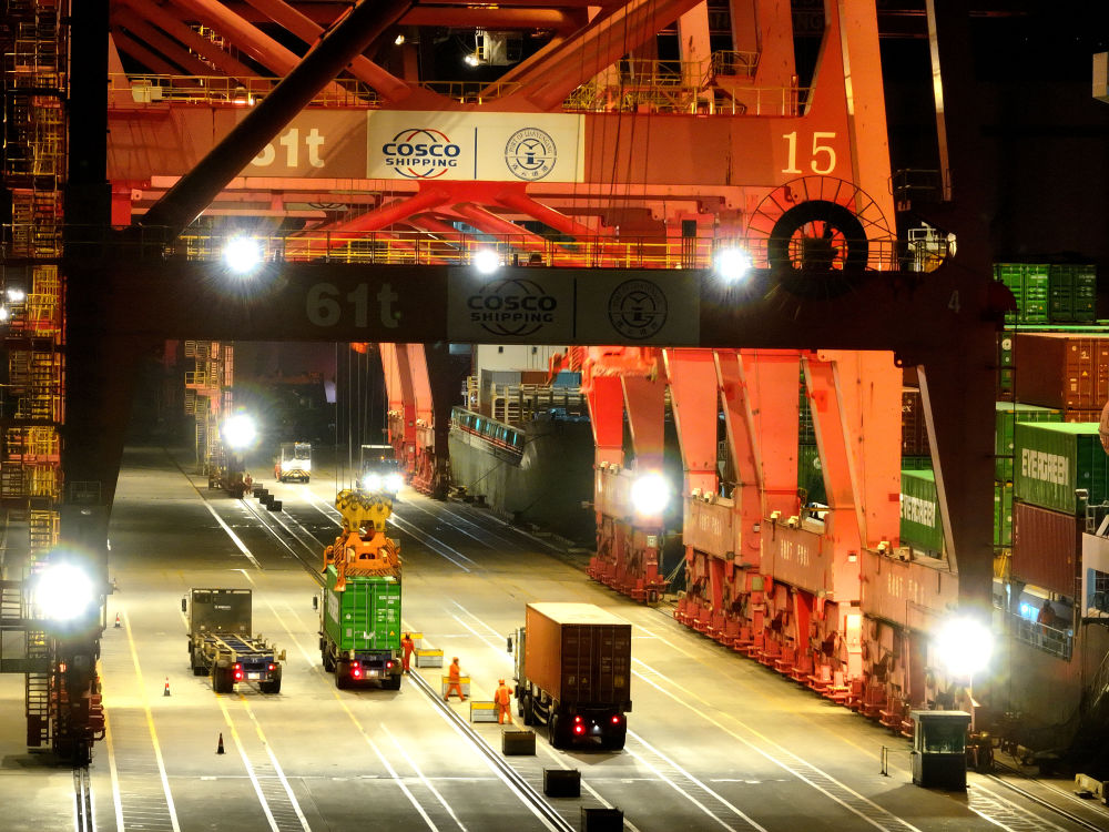 ↑ 2月16日凌晨,江蘇省連云港港集裝箱碼頭燈火通明,工作人員在運輸、裝卸集裝箱(無人機照片)。新華社發(fā)(王春攝)