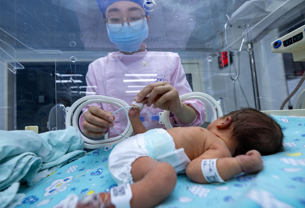 ↑ 2月16日,在南京醫(yī)科大學(xué)附屬泰州人民醫(yī)院新生兒科,護士為新生兒護理。新華社發(fā)(湯德宏攝)