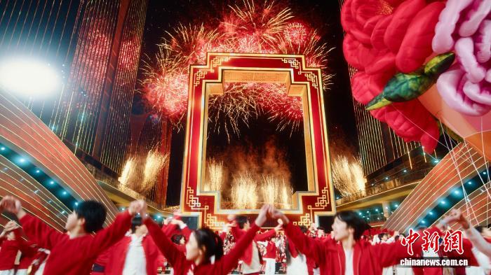 中新網(wǎng)義烏2月17日電(董易鑫)一扇巨型中式窗戶矗立于充滿科技感的浙江義烏全球數(shù)貿(mào)中心,舞臺向前延展,兩側(cè)裝飾如潮涌浪花般,鋪陳出“勇立潮頭”的意象……