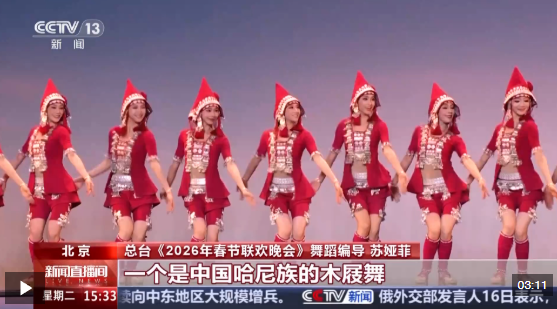 總臺(tái)《2026年春節(jié)聯(lián)歡晚會(huì)》舞蹈編導(dǎo) 蘇婭菲:這次的作品中有中國(guó)的兩個(gè)不同的舞種,一個(gè)是哈尼族的木屐舞,一個(gè)是中國(guó)傈僳族的阿尺木刮,它也是國(guó)家級(jí)非遺。還有兩支來自國(guó)外不同的團(tuán)隊(duì),一個(gè)來自匈牙利,表演的是匈牙利的萊蓋涅什,是他們的傳統(tǒng)民族舞蹈,一個(gè)是西班牙的一支舞蹈團(tuán),表演的就是弗拉門戈。