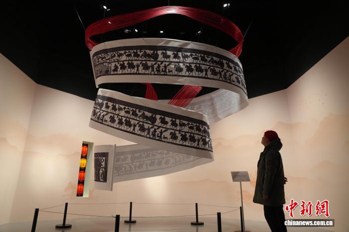 2月19日,安徽博物院展出的以漢代車(chē)馬出行拓片圖為核心創(chuàng)作的藝術(shù)裝置。中新社記者 張俊 攝