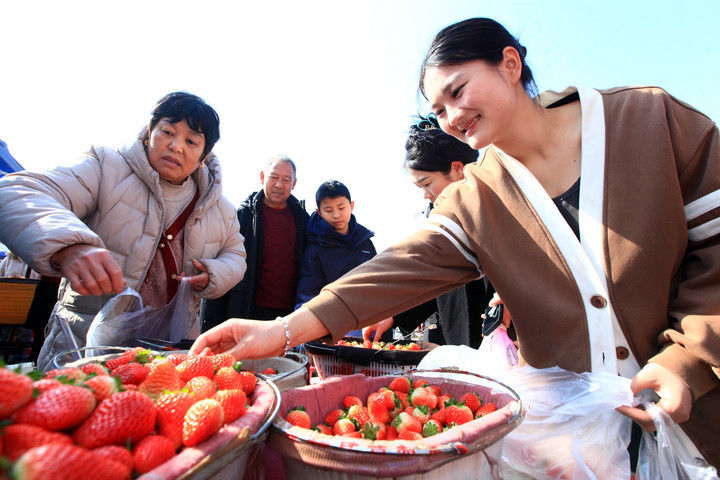 在江蘇邳州邢樓鎮(zhèn)的邢樓大集上,顧客在選購本地草莓(2月14日攝)。蒯創(chuàng)攝