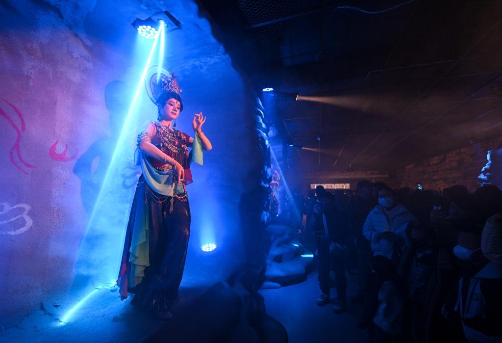 馬年春節(jié)期間,寧夏銀川市賀蘭山下格外熱鬧。走進西夏陵博物館后數(shù)百米長的廊道,游客仿佛穿越回千年前的西夏——身著各民族傳統(tǒng)服飾的“商賈”沿街叫賣,“麻魁”女兵英姿颯爽,西夏壁畫中的“飛天”在神秘煙霧與燈光中翩躚起舞……
