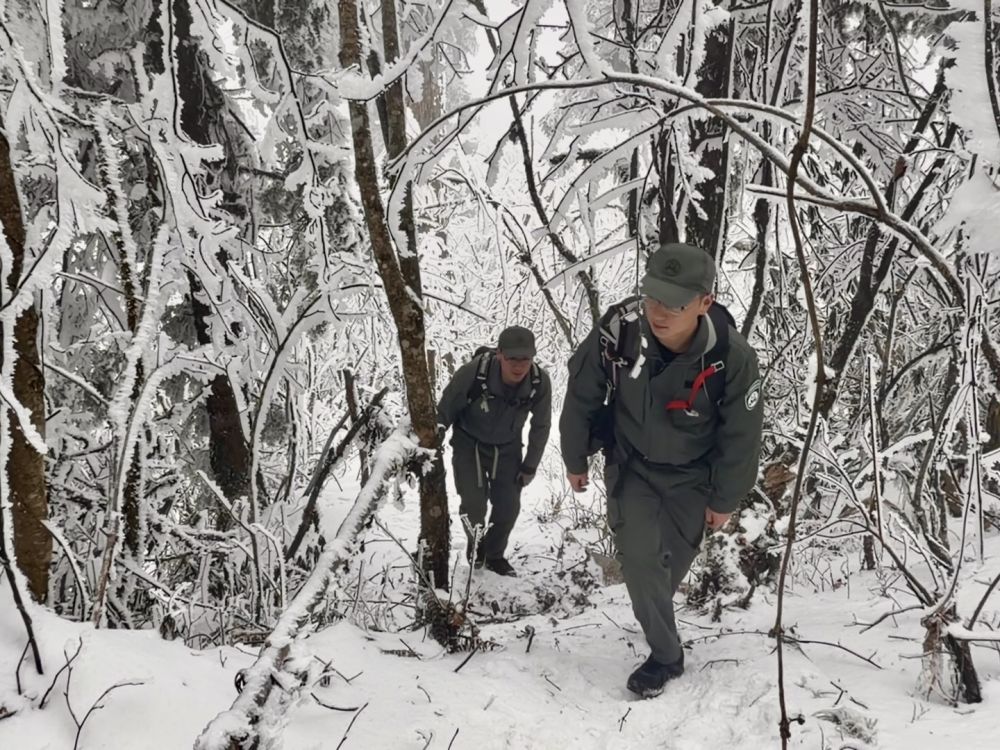 筒靴有點大,走起路來鞋底有些打滑,但踩進(jìn)深深的雪地里確實不濕腳了。王偉已經(jīng)在山里摸爬滾打了七年,毛軍剛?cè)肼氁荒?,兩個人是巡山的“搭檔”。一人負(fù)責(zé)巡護(hù),另一人則負(fù)責(zé)科研,是站里常見的組合。