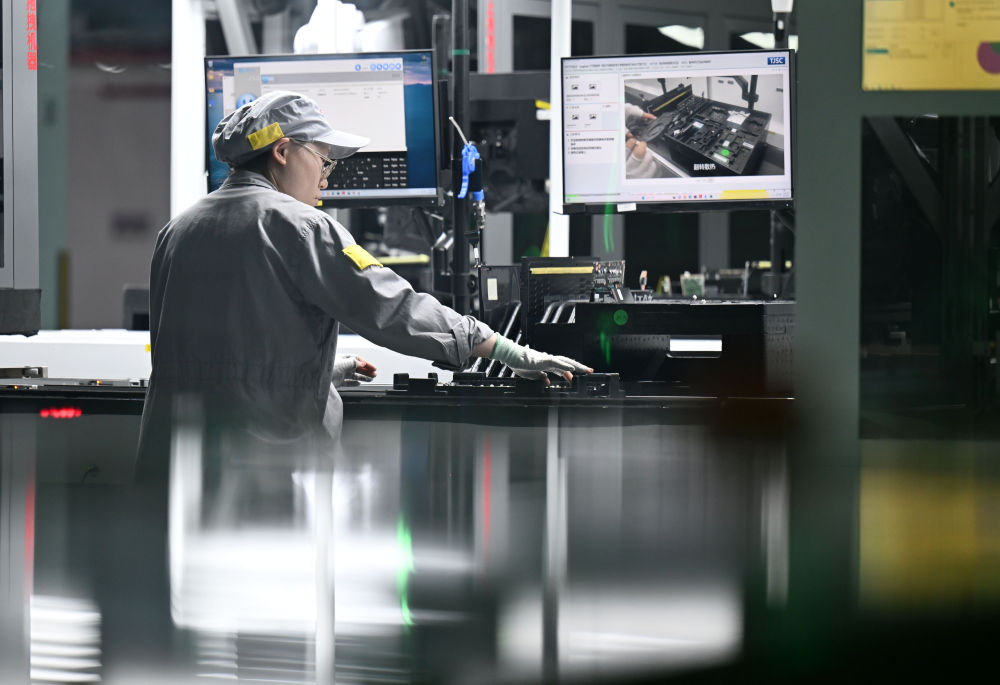 工作人員在聯(lián)想天津零碳智造工廠筆記本生產(chǎn)線進(jìn)行作業(yè)。新華社記者趙子碩 攝