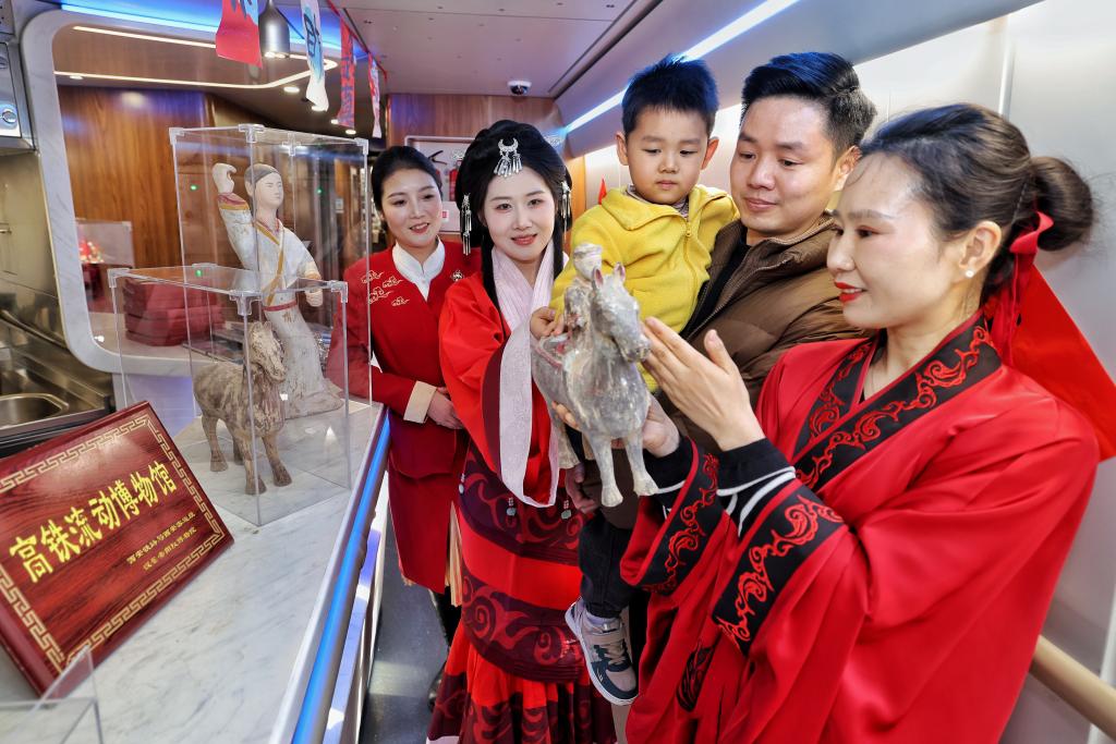 2月11日,南方小年。由西安北發(fā)車(chē)的G916次列車(chē),車(chē)廂內(nèi)被打造成沉浸式漢代文化體驗(yàn)空間,以漢代馬形文物為靈感的主題車(chē)窗貼熠熠生輝,馬蹄酥等特色美食飄香四溢,馬年元素貫穿全程。