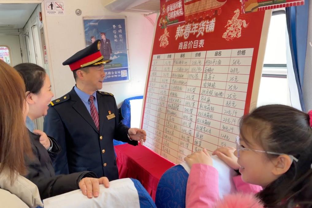 5640次列車(chē)列車(chē)長(zhǎng)胡貴川向旅客介紹年貨價(jià)格。(國(guó)鐵成都局集團(tuán)公司貴陽(yáng)客運(yùn)段供圖)