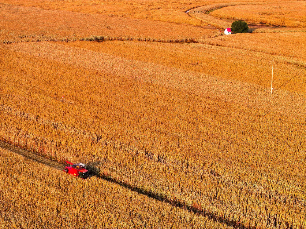 農(nóng)機(jī)手駕駛收割機(jī)在內(nèi)蒙古自治區(qū)通遼市科爾沁區(qū)豐田鎮(zhèn)收割玉米(2025年10月14日攝,無(wú)人機(jī)照片)。“十四五”時(shí)期,糧食總產(chǎn)量由2021年的1.37萬(wàn)億斤增至2025年的1.43萬(wàn)億斤,連續(xù)兩年站穩(wěn)在1.4萬(wàn)億斤的臺(tái)階。