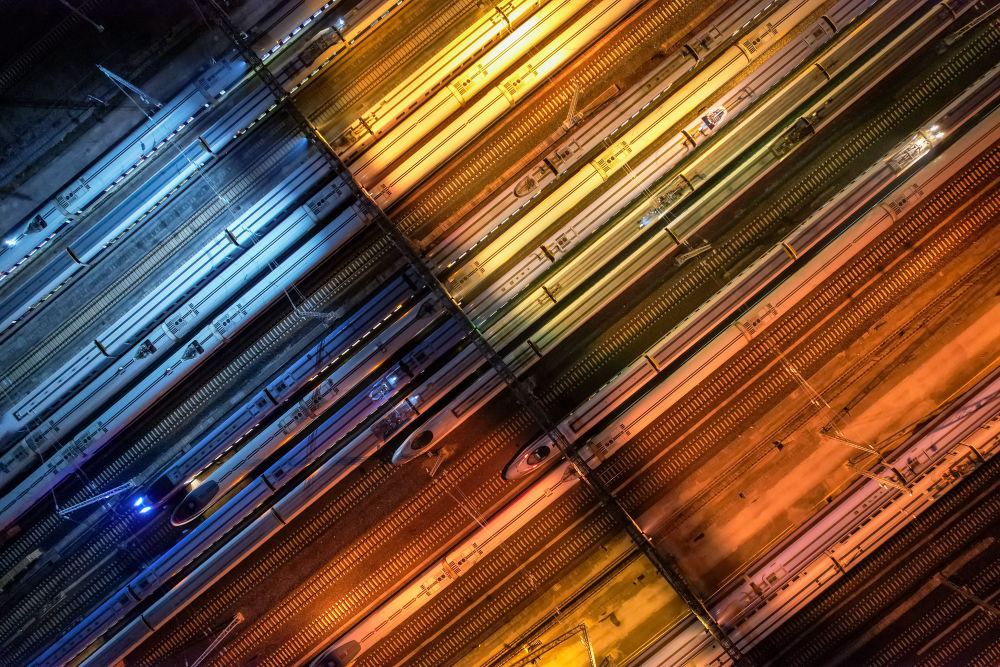 動(dòng)車(chē)組列車(chē)停靠在貴陽(yáng)北動(dòng)車(chē)所內(nèi)(2023年1月6日攝,無(wú)人機(jī)照片)?!笆奈濉逼陂g,我國(guó)建成世界規(guī)模最大、先進(jìn)發(fā)達(dá)的高速鐵路網(wǎng)。