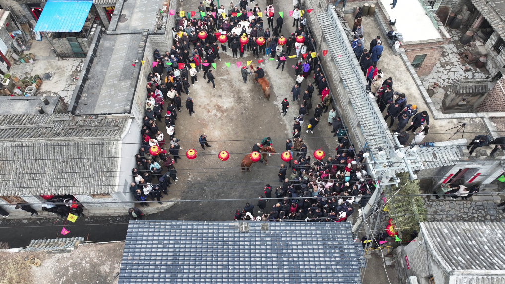 3月4日,農歷正月十六,這個距離娘子關僅6公里的小山村,迎來了一年中最熱鬧的時刻,村中那條長約400米、寬不足4米的青石古巷上,里三層外三層擠滿了人。沿路民房的臺階上、門檻上,甚至屋頂上,都早已站上了不請自來的看客,主人家卻也毫不在意:“今天這個大日子,大家一起熱鬧熱鬧!”