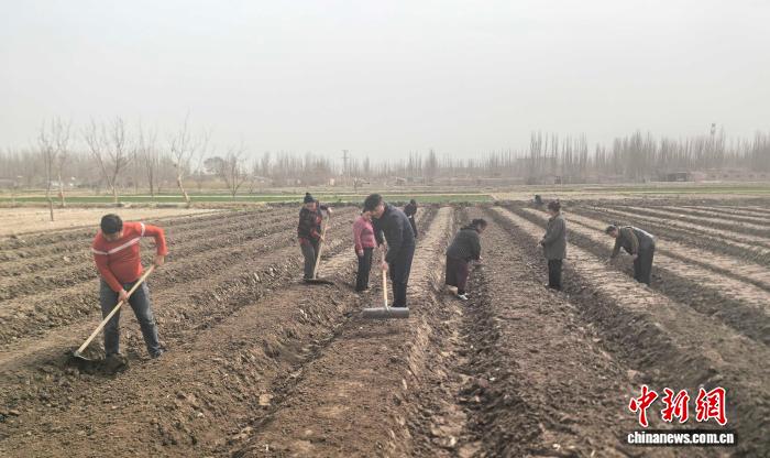 楊永鵬(中)與種植戶一起春耕。受訪者供圖