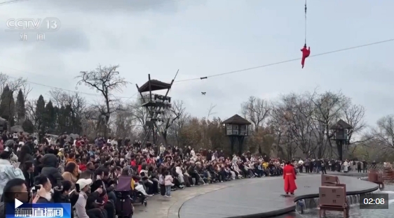 在河南開封的萬歲山武俠城景區(qū),穿著戲服在臺(tái)上斷案的并不是演員,而是現(xiàn)場(chǎng)選取的游客。在這里,從街頭到巷尾,風(fēng)格各異的演員帶著游客猜拳、破案、比武功,甚至一起走入劇情演繹角色。通過參與互動(dòng),游客還能賺取“銀票”在景區(qū)購(gòu)物,沉浸體驗(yàn)古代市井生活。景區(qū)里戰(zhàn)馬奔騰、云梯攻城等實(shí)景演出輪番上演。