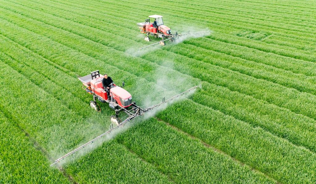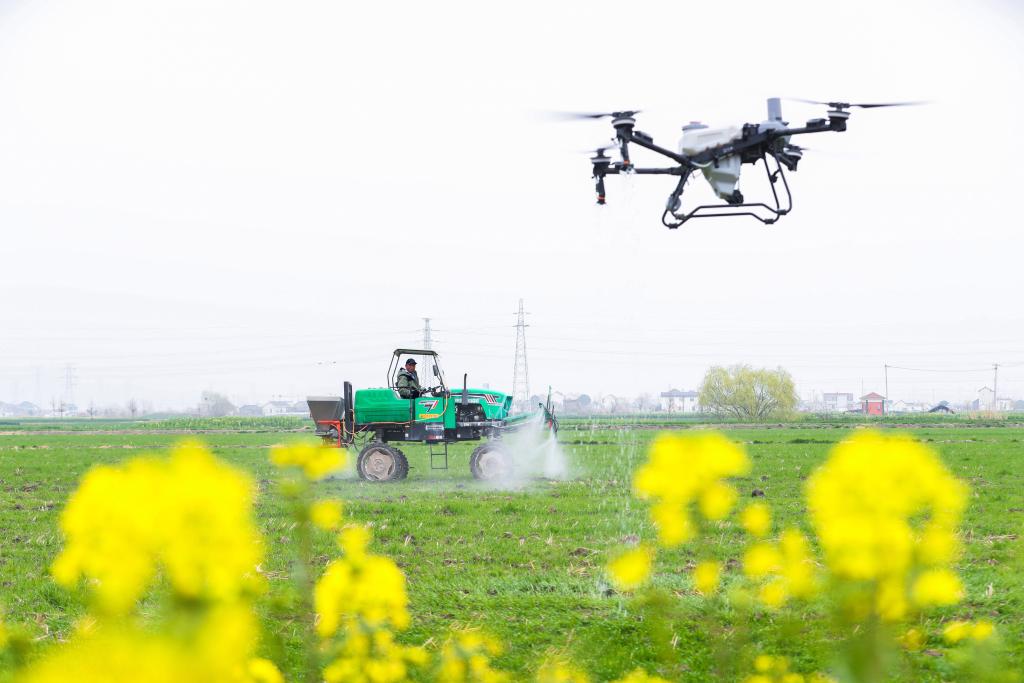 3月13日,在江蘇省興化市陳堡鎮(zhèn)蔣莊村,農(nóng)民駕駛植保無人機(jī)、自走式噴桿噴霧機(jī)實(shí)施雜草防治作業(yè)。新華社發(fā)