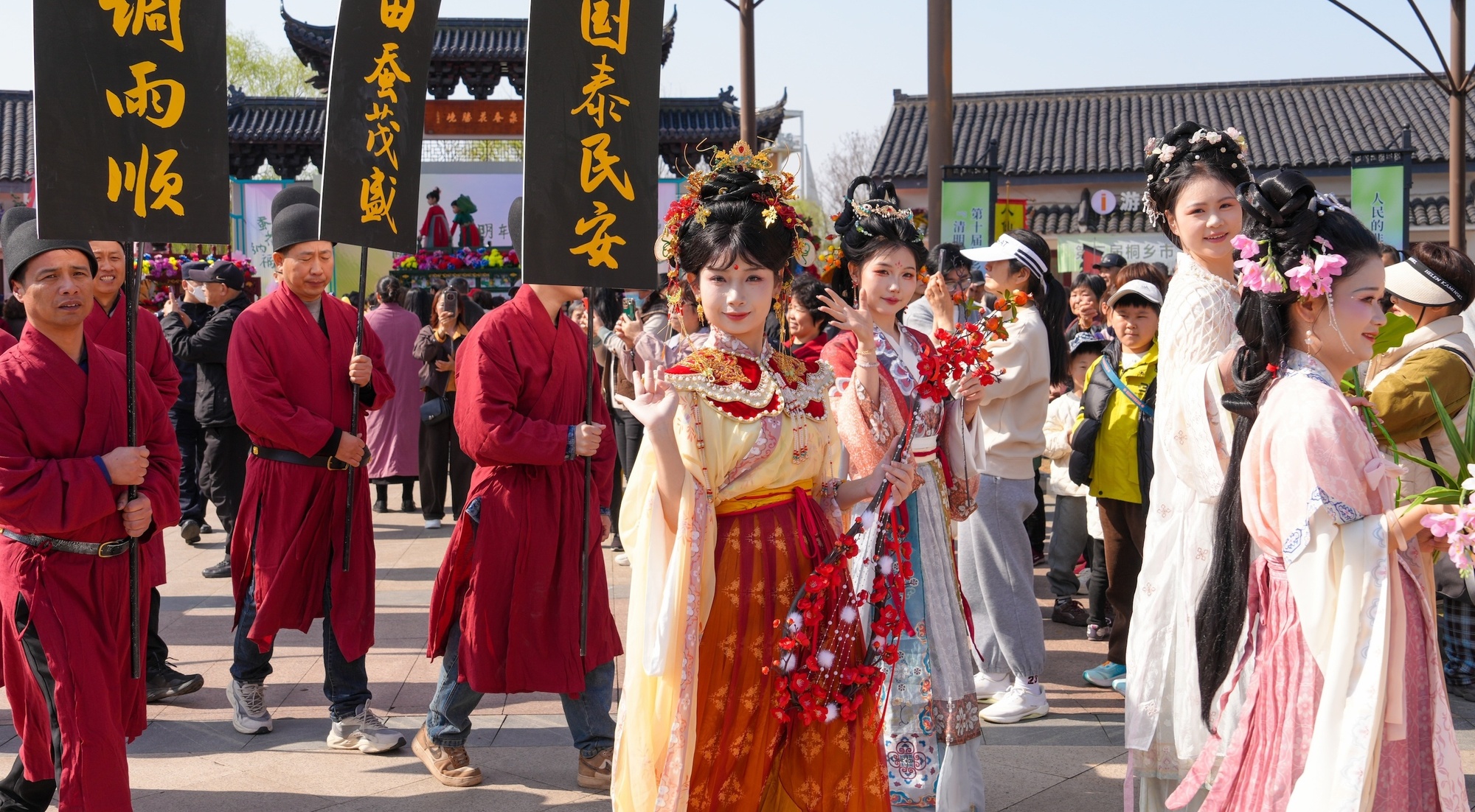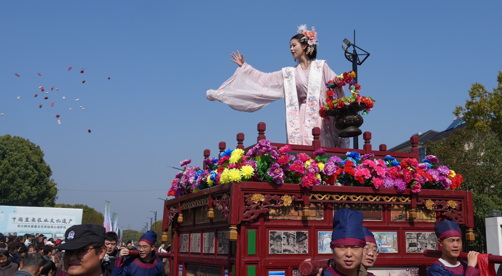當天上午,蠶花“禮”民俗儀式上,每一個環(huán)節(jié)都承載著蠶鄉(xiāng)兒女對風調(diào)雨順、蠶花茂盛的美好祈愿。最令人期待的當屬民俗巡游展演。來自桐鄉(xiāng)全市各鎮(zhèn)(街道)的民間民俗隊伍浩浩蕩蕩穿行于村道之間;蠶花仙子與十二花神乘花船翩然而至,沿途撒下寄托祝福的蠶花,與游客互動答題。