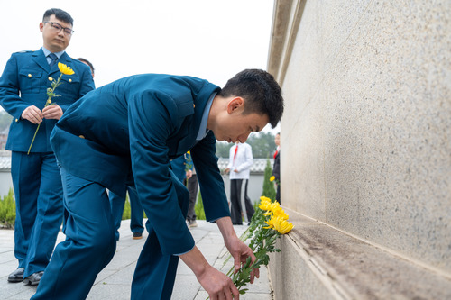 在莊嚴(yán)肅穆的烈士紀(jì)念碑前,全體人員向烈士英魂鞠躬默哀、敬獻(xiàn)菊花,表達(dá)對革命先烈的深切懷念和崇高敬意。
