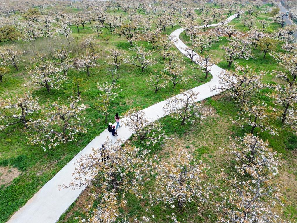 4月3日,游客在梨園內(nèi)賞花(無(wú)人機(jī)照片)。時(shí)下,山東省滕州市柴胡店鎮(zhèn)近萬(wàn)畝梨園進(jìn)入盛花期,梨花競(jìng)相綻放。新華社記者 朱崢 攝