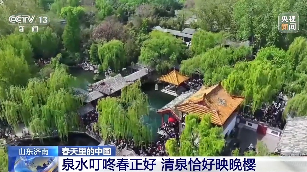 山東濟(jì)南:泉水叮咚春正好 清泉恰好映晚櫻
