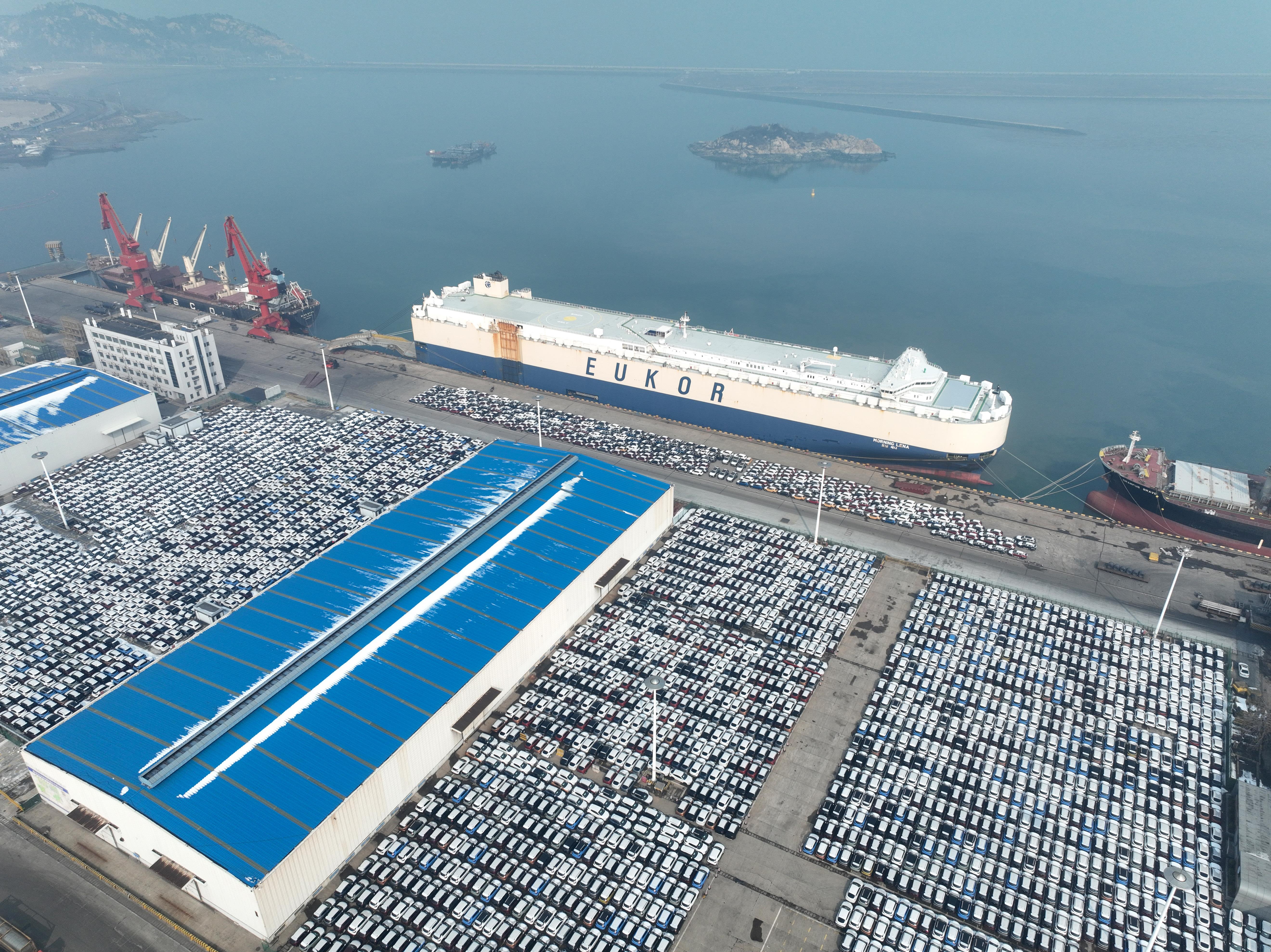 在江蘇連云港港東方港務(wù)分公司碼頭,貨輪靠泊準(zhǔn)備裝載汽車(chē)出口海外。