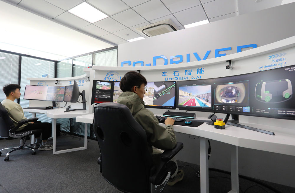 在位于中國(上海)自由貿(mào)易試驗區(qū)臨港新片區(qū)的一家智能駕駛企業(yè),工作人員通過無人駕駛汽車遠程監(jiān)管平臺的實時畫面,結合電子地圖對在自動駕駛測試專用路上行駛的車輛進行監(jiān)管(2024年4月9日攝)。